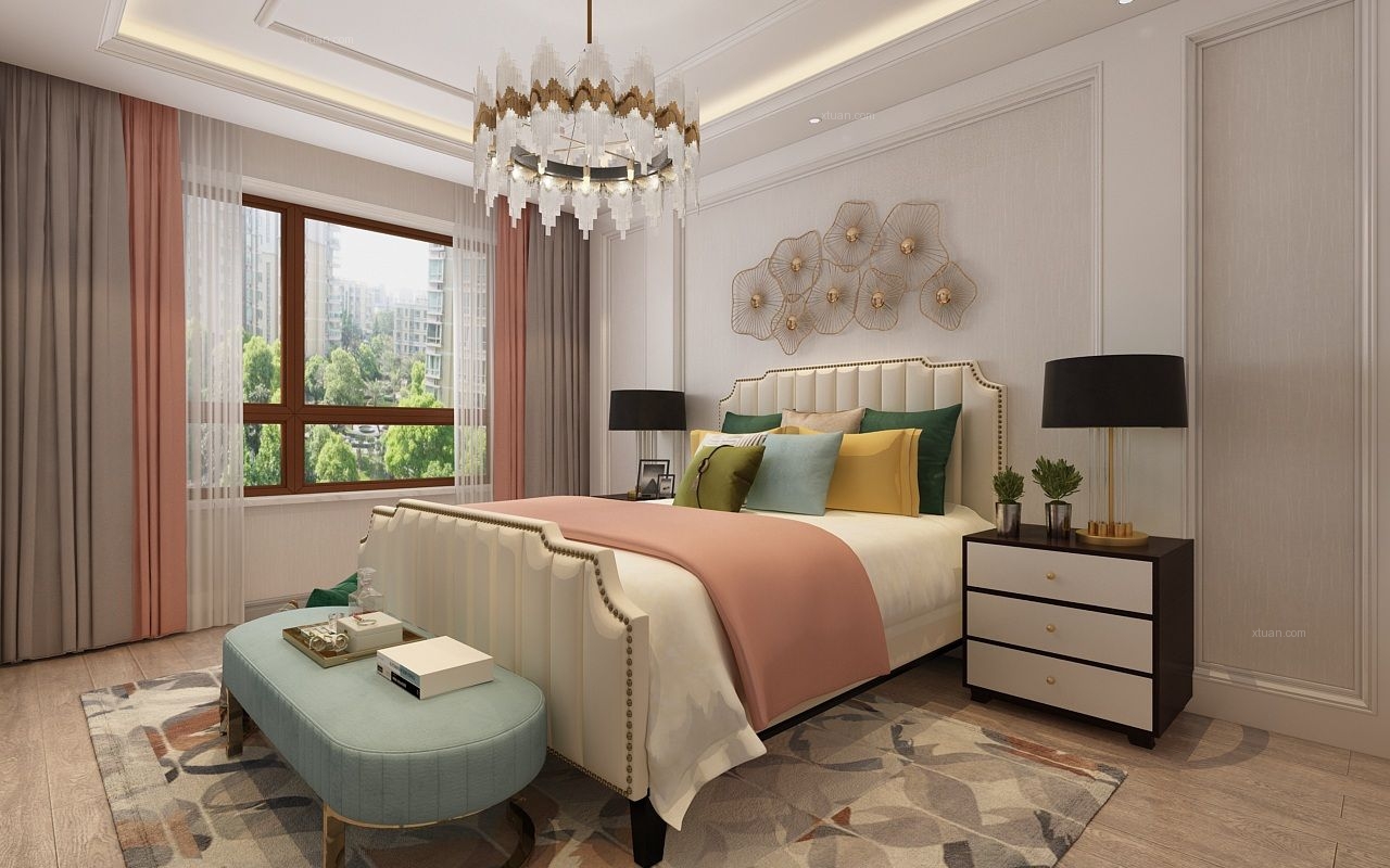 以古典轻奢风为主的卧室,主要是注重对线条的勾勒,和对细节上的刻画,符合"低调、奢华有内涵"这一描述。