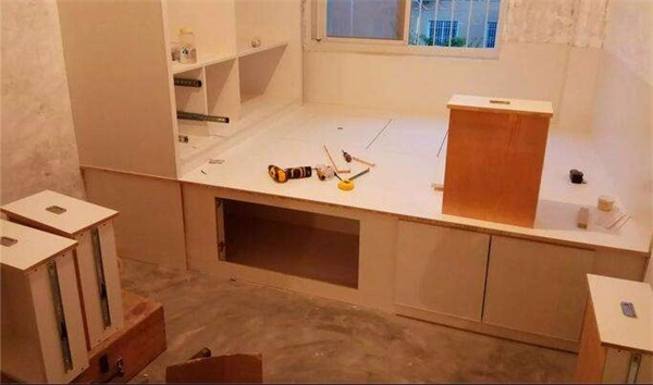 以上步骤都完成之后,啊呢么木作施工台就需要进行搭建了。其主要用于切割板材和进行造型处理,以及细节的修饰等。