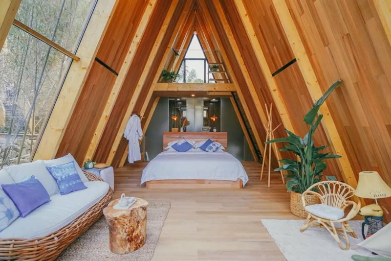 亚麻、纯棉等物料的加入,强化了自然的属性。通过材质柔和光线,拉近自然的感受,始终贯穿整个设计思路。清新的空气,温柔的光线,是假期最佳的伴奏。