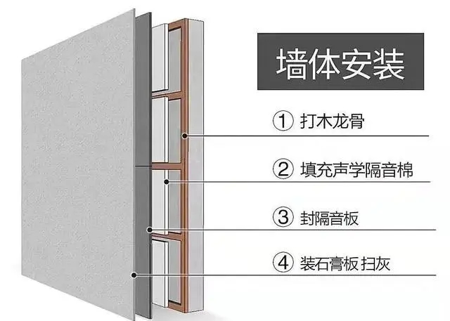 在墙面打木龙骨→填充声学隔音棉→确认隔音板安装位置→根据尺寸剪裁隔音板→用射钉将隔音板固定在龙骨上→射钉嵌入2/3以上且排布均匀→最后装上石膏板→扫灰。