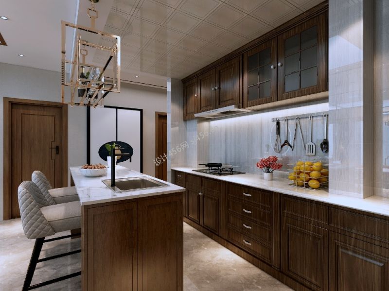136平米现代中式风格三居室厨房吧台餐桌设计图
