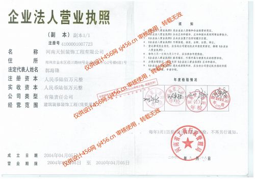 河南天恒装饰工程有限公司是一家成立于2004年,注册资金600万,拥有国家建设部设计施工一体化二级资质及公安系统安全技术防范许可证,秉持“立足河南,开拓全国”的长远发展为目标,率先在国内推出“主题化设计”并致力成为国内装饰行业领导者企业。 天恒员工秉承着“高效务实、真诚守信、认真负责、团结奋进”的企业精神;以“让客户获得更多满意”为服务宗旨;信奉“沟通、理解、关爱”的情感文化,服务于每一个工程从而创造一个规范、专业的现代装饰企业。 天恒实力:施工技术力量雄厚、集勘察、设计、施工、技术经济咨询为一体。可独立承接企业办公空间、娱乐餐饮空间、商业空间、室内外工程装饰设计施工及中高档住宅装修、集成家居设计等装饰施工工程。在设计上,以“专家设计顾问团”领衔,并以“将设计进行到底”、“集成设计、方案评议”的模式,打造“专业化的设计”;在施工上,天恒以“超国标”施工规范,“军事化”管理体系,以及实施对工程质量进行全面、动态监控的“质管台质量监控体系”、“逐级质量保障体系”,真正有效的维护了客户的切身利益;在监理上,确立和执行领先行业标准的工程验收体系,公司整体服务,采用专业、贴心的“全程跟踪服务体系”,彻底解决客户的后顾之忧。 天恒公司以质量、信誉为企业的生命线,走品牌化、规范化的道路。目前公司的服务,已遍布省内的每一个角落,且已设立了多家分公司,并向成为一家大型装饰连锁企业大步前进。 成功只属于过去,面对激烈竞争的装饰市场,我们以自信、坦诚的态度,科学、严谨的作风,参与竞争,自立于行业之林。