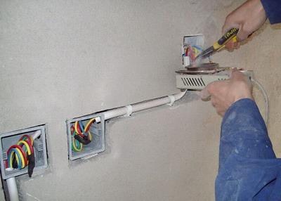 5、电线线路开槽:施工负责人在与业主商量好用电功能与要求之后,与电工师傅交底,弹好平行与垂直线开槽。放好开关插座底盒。插座类距地面40厘米开槽,挂式空调插座距地面2.2米开槽,开关距地面1.2—1.4米开槽。开关插座底合安装要弹水平线开槽。厨卫间须根据设计的使用功能进行弹线开槽。